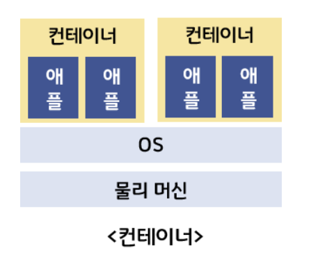 | 개념 | 호스트 OS 위에 가상화 소프트웨어를 설치하여 게스트 OS를 실행하는 방식 | 하드웨어에 직접 하이퍼바이저(가상화 S/W)를 설치하여 그 위에 가상 머신(게스트 OS)을 실행하는 방식 | 호스트 OS의 커널을 공유하며, 프로세스를 격리하여 애플리케이션을 실행하는 방식 |